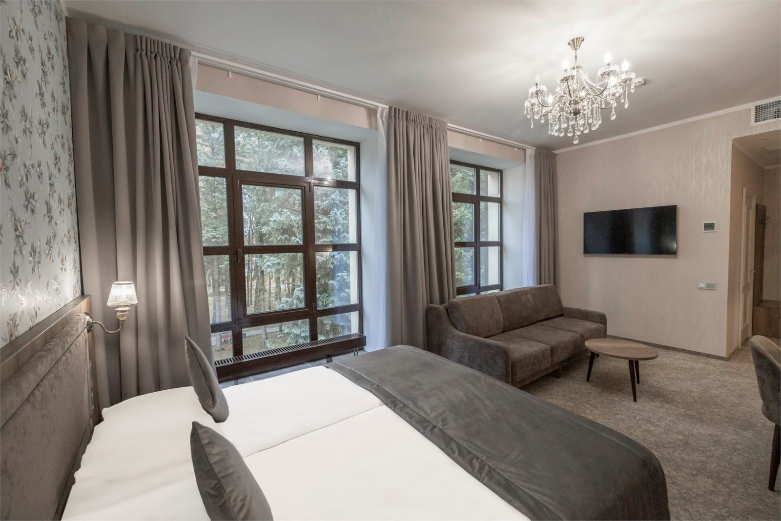 • Видовая локация: Панорамное окно и личный балкон с видом на парковую аллею и вековые ели.
