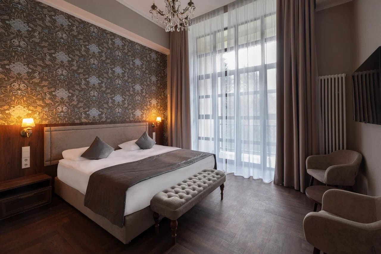 Номер отлично подходит для отдыха вдвоём в спокойной обстановке. Этот номер — оазис покоя и утонченной элегантности. Войдя внутрь, вы погружаетесь в атмосферу уюта и гармонии. Тёплые оттенки создают ощущение комфорта, а изящные текстуры и детали дарят незабываемые впечатления. Центральное место в спальне занимает просторная кровать с мягким изголовьем, идеально подходящая для наслаждения сладкими снами. Окно, увенчанное густыми занавесками, открывает вид на зелёные просторы, наполняя комнату мягким естественным светом. Изящный столик с удобным креслом располагает к моментам тишины и продуктивной работы. Ванная комната восхищает своей функциональностью и изысканностью. Современные линии и приглушённые цвета создают умиротворяющую атмосферу, идеально подходящую для расслабления после насыщенного дня. Этот уголок спокойствия приглашает вас погрузиться в мир уюта и комфорта, где вы сможете отдохнуть и набраться сил для новых открытий.