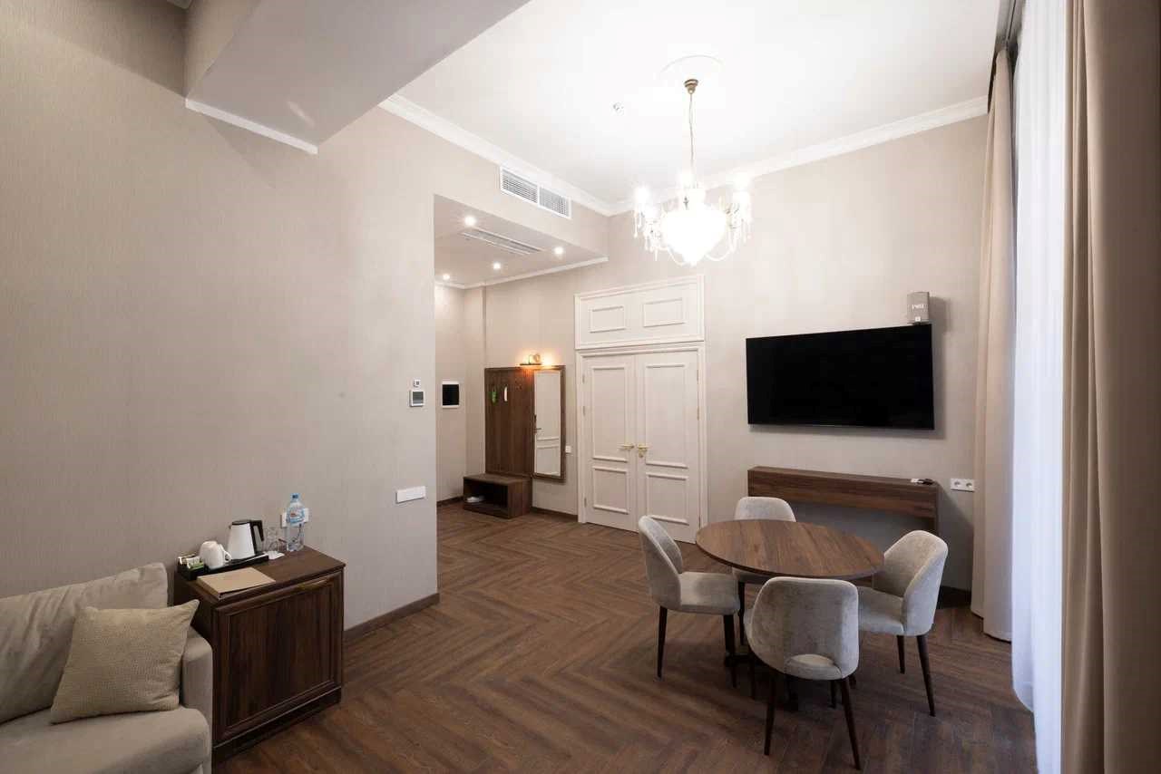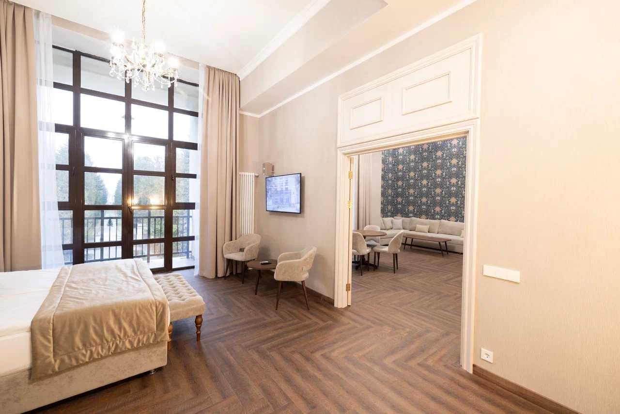 Просторная спальня с роскошной кроватью обещает сладкие сны, в то время как изысканная гостиная приглашает на дружеские беседы за чашкой ароматного кофе. Каждый элемент декора здесь подобран с любовью: от стильных обоев до изящной люстры, создающей атмосферу вне времени. Ванная комната - это настоящая ода современному дизайну, где каждое утро начинается с чувством свежести и обновления. Простор и функциональность встречают здесь эстетику, создавая идеальное пространство для расслабления. С балкона открывается роскошный вид на центральную парковую зону с многолетними елями и исторической аллеей курорта. Номер оснащены умной технологией, позволяющей создать идеальную атмосферу одним прикосновением или голосовой командой. Управляйте светом, выбирая идеальную яркость и цветовую температуру для чтения, романтического вечера или расслабления. Особенно впечатляет режим "Свеча", имитирующий живое пламя. Электрокарнизы открывают или закрывают шторы с помощью голоса или пульта, позволяя наполнить номер утренним солнцем или создать приватную обстановку. Полноцветная LED-лента добавляет современности интерьеру, позволяя выбрать любой цвет или режим: мерцание, переливы или статичный свет. Датчики движения в душевых включают свет автоматически, а система микроклимата позволяет голосом узнать температуру и влажность в номере. Центральный узел управления и развлечений, позволяющий управлять всеми системами номера, включать музыку и получать важную информацию. Этот номер позволяет Вам создать пространство, идеально подходящее под ваши желания. Всё под рукой или под голосом, что делает ваш отдых максимально комфортным. Вы будете чувствовать себя в авангарде современного гостеприимства.