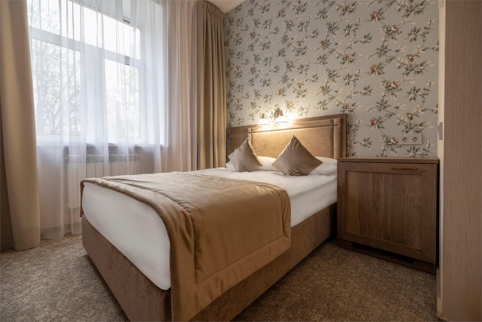 Современный и удобный вариант отдыха для двоих. Погрузитесь в атмосферу уюта и стиля, где каждый элемент продуман для вашего комфорта. Комната с теплой и спокойной цветовой гаммой, украшенная элегантными текстурами и изысканным декором, создает ощущение домашнего уюта. Большое окно пропускает мягкий дневной свет, нежно играющий на стенах и подчеркивающий теплые тона интерьера. Комната наполнена теплом и светом, создавая идеальное место для отдыха после насыщенного дня.